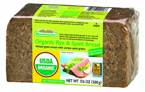 Mestemacher all natural whole grain, sourdough based bread with unripe spelt grains. Carries the Whole Grain Association's stamp of 100% excellent source of whole grain. Diets rich in whole grain foods and other plant foods, and low in total fat, saturated fat, and cholesterol, may help reduce the risk of heart disease and certain cancers. Long shelf life obtained through pasteurization. Also delicious when toasted. Imported from Germany by Carl Brandt, Inc. Original German Natural Rye & Spelt Bread in U.S. marketplace. Baked with ingredients naturally grown without the use of artificial, chemical fertilizers or pesticides.Mestemacher Organic Rye & Spelt Bread, 17.6 Ounce Packages (Pack of 12) - I strongly suggest you to get it at Amazon.com. They have Special offer this time.