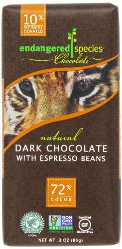 Endangered Species Chocolate All-Natural Tiger Bar - Dark Chocolate with Espresso Beans (72% Cocoa Content) This 3oz. dark chocolate bar is made with all-natural, shade-grown, ethically traded rich dark chocolate and organic, Fair Trade espresso coffee bEndangered Species Tiger, Dark Chocolate (72%) with Espresso Beans, 3-Ounce Bars (Pack of 12) - I recommend you to buy it at Amazon.com. They have Special offer this time.